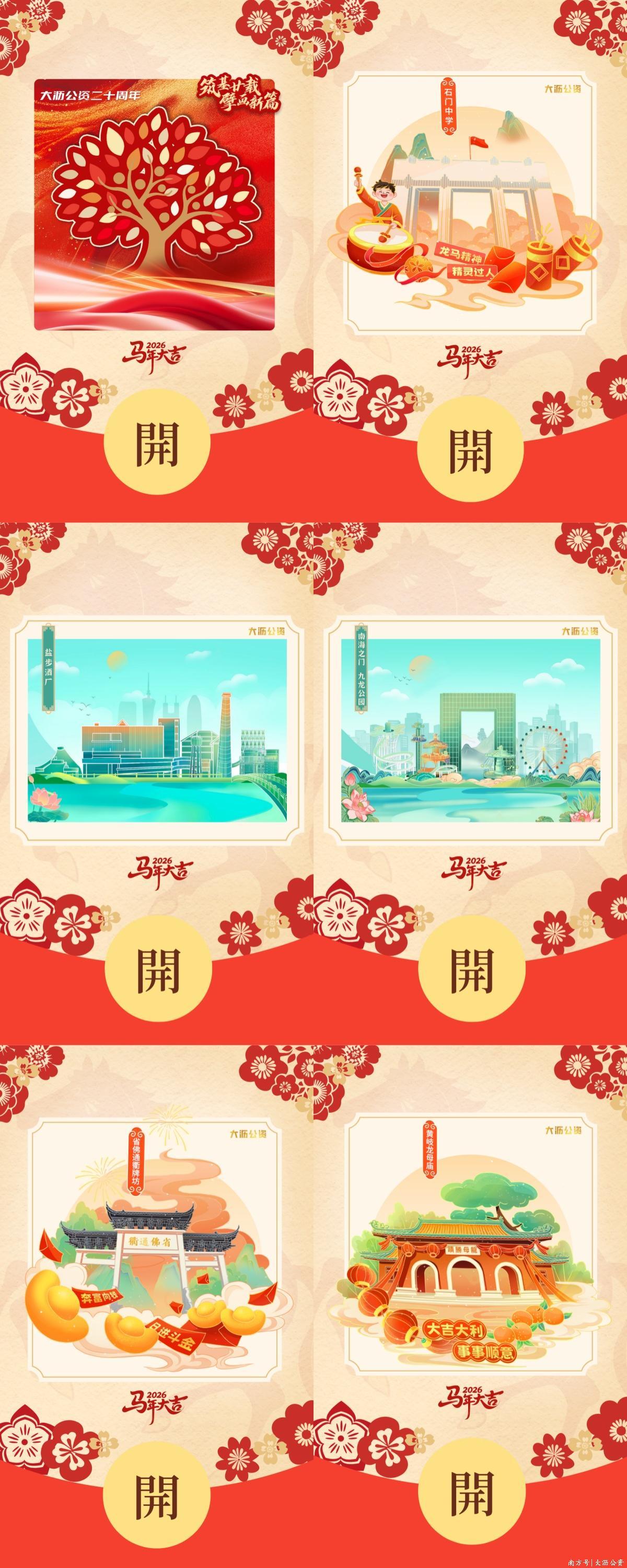 大沥公资二十周年纪念版“擘画新篇”,大沥地标建筑系列——盐步酒厂、南海之门&九龙公园、石门中学,大沥传统建筑系列——省佛通衢牌坊、黄岐龙母庙。六款封面以新春红包为载体,传递城市发展的蓬勃活力与对未来的美好祝福!