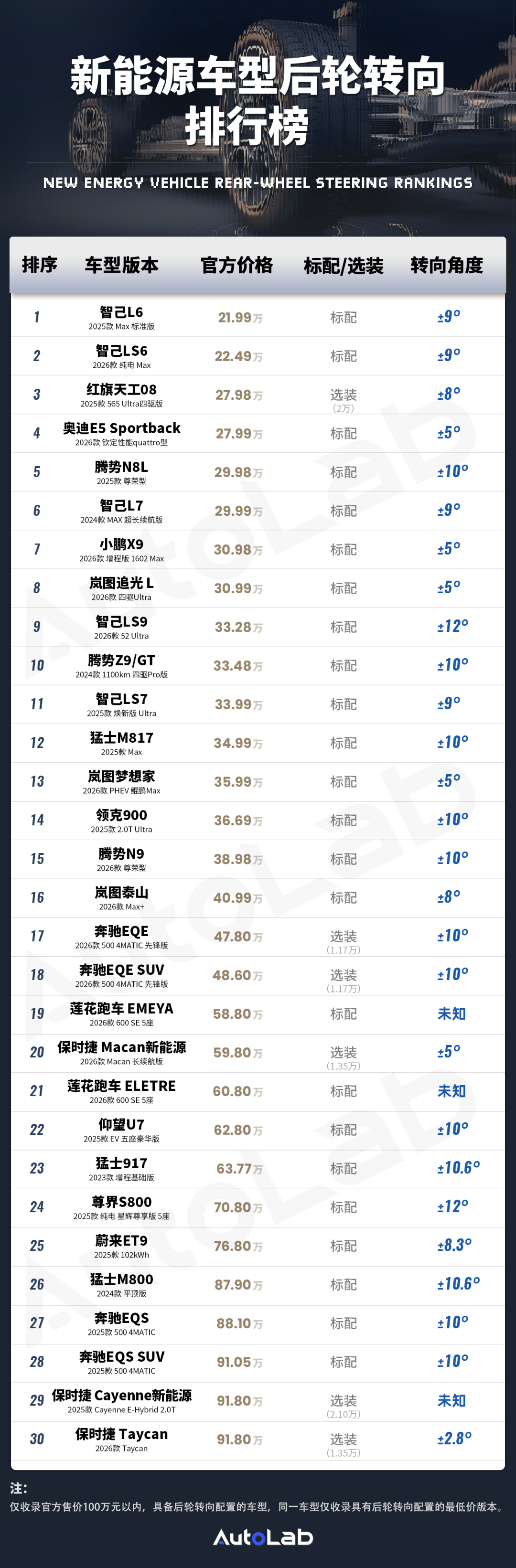 另外,在这份榜单上可以看到:智己LS9、尊界S800已经可以做到最大单向12度的后轮转向,不仅比奔驰S级单向最大10度的转向角更大,也是目前行业内后轮转向角度最高的车型。